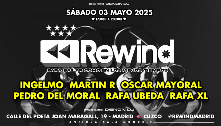 Otra espectacular sesión de música Remember en Rewind, en la Sala Next Clubbing en calle Poeta Joan Maragall, 19 en Madrid. (Metro Cuzco) este Sábado 25 de enero del 2025 desde las 17h a las 23:30h. Con los DJs: Ingelmo (BDAY), Jesús Elices, Martin R., Óscar Mayoral (BDAY), Pedro del Moral y Rubén Durán